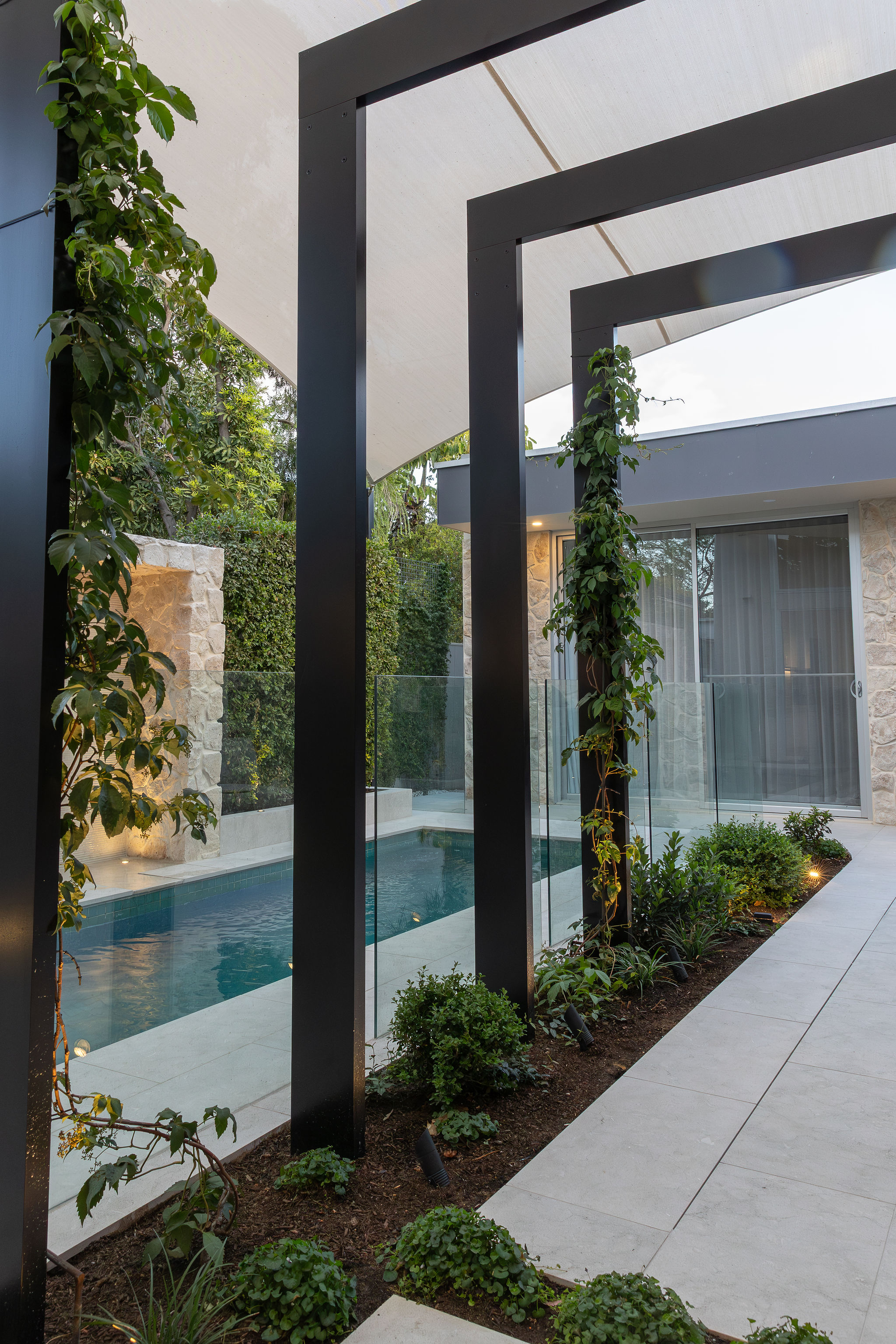 We love seeing Olivia Limestone installed around pools, against greenery, and softened by timber elements throughout landscape design.