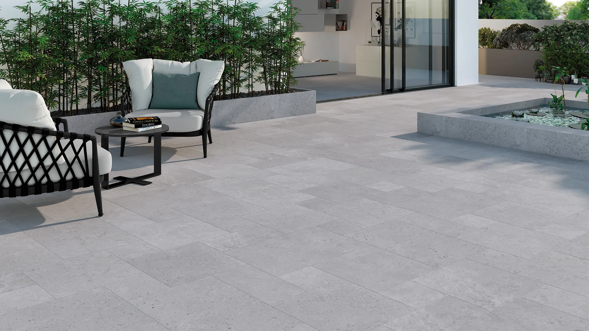 With a textured weathered surface and a structured finish this tile is perfect as an alternative for outdoor pavers, in a modular French pattern.