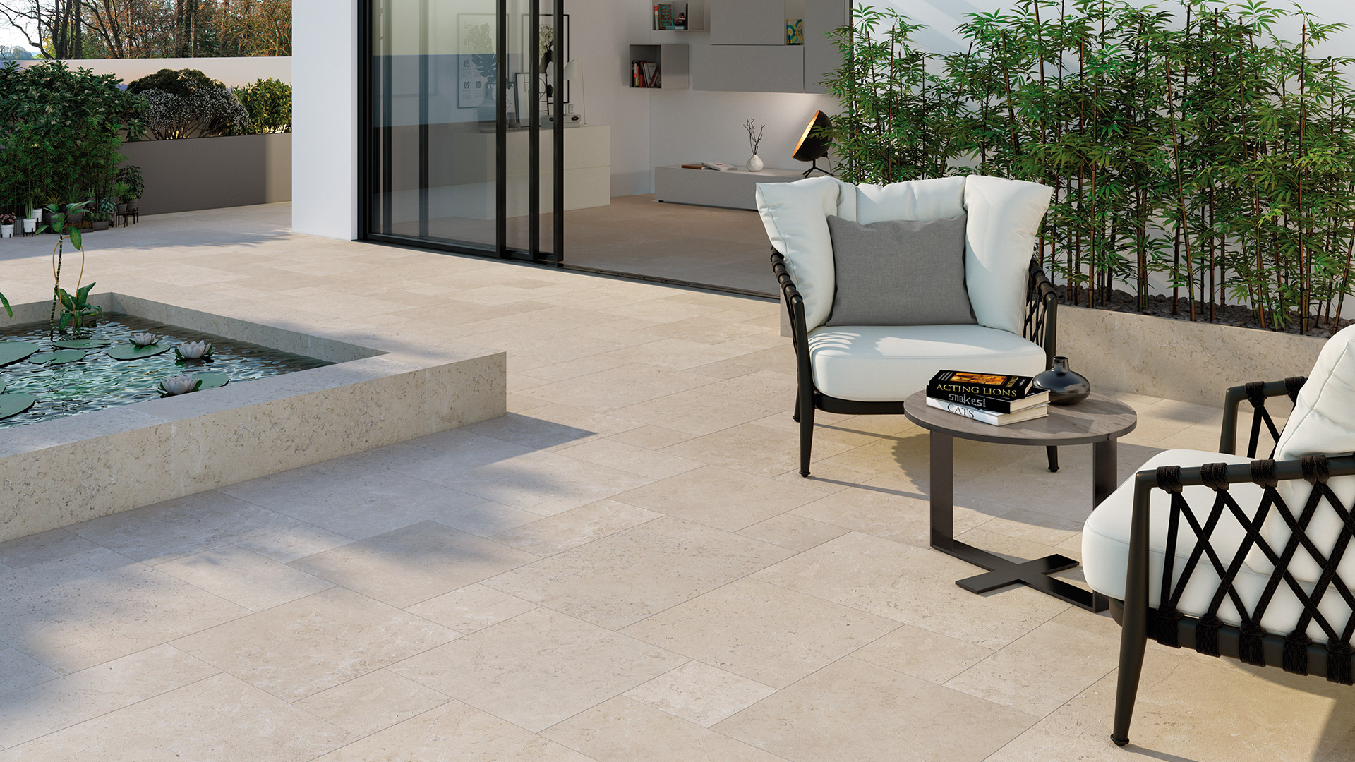 European alfresco styling is only a step away when you consider the Ostuni natural stone marble, French pattern tile.