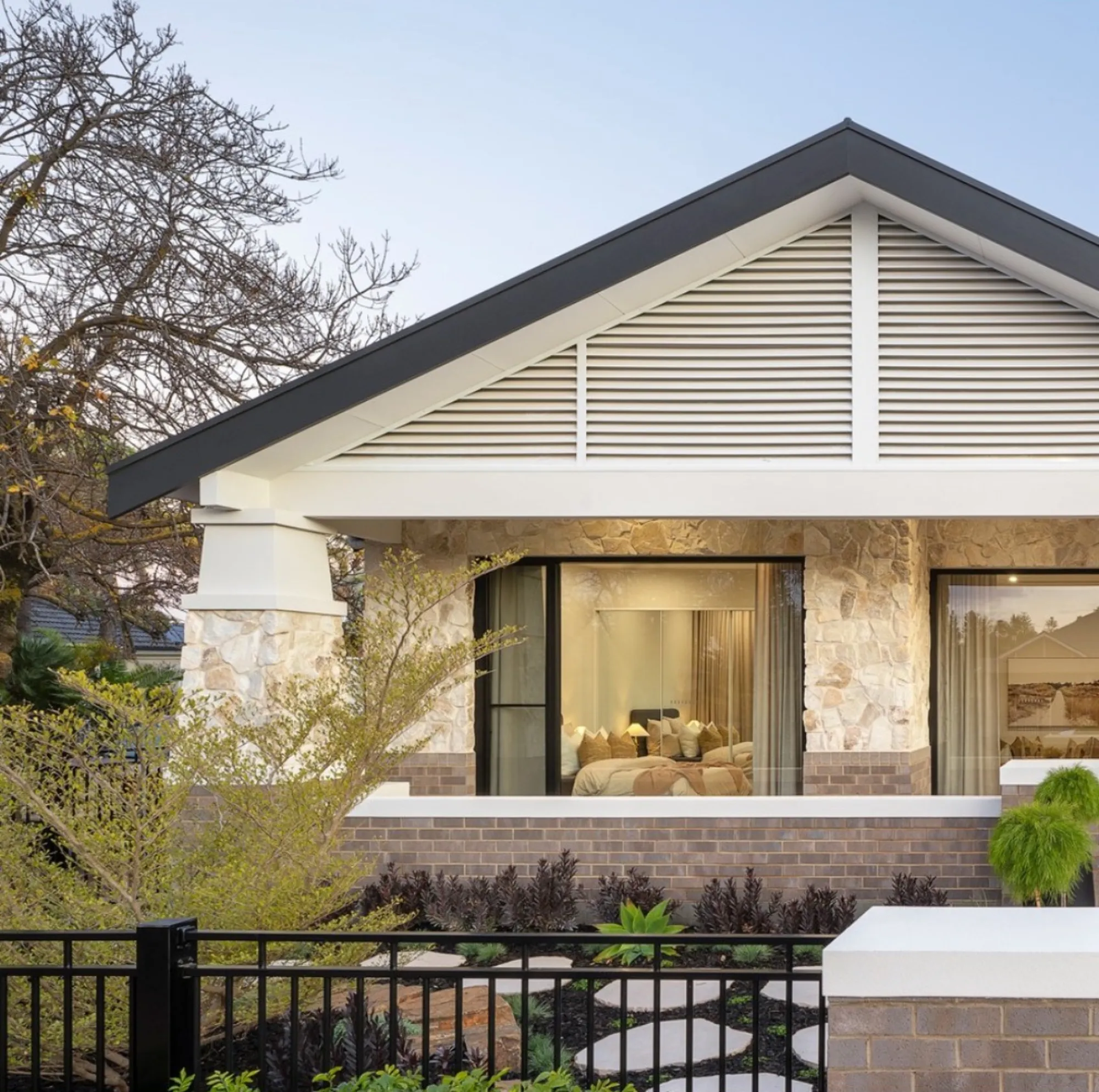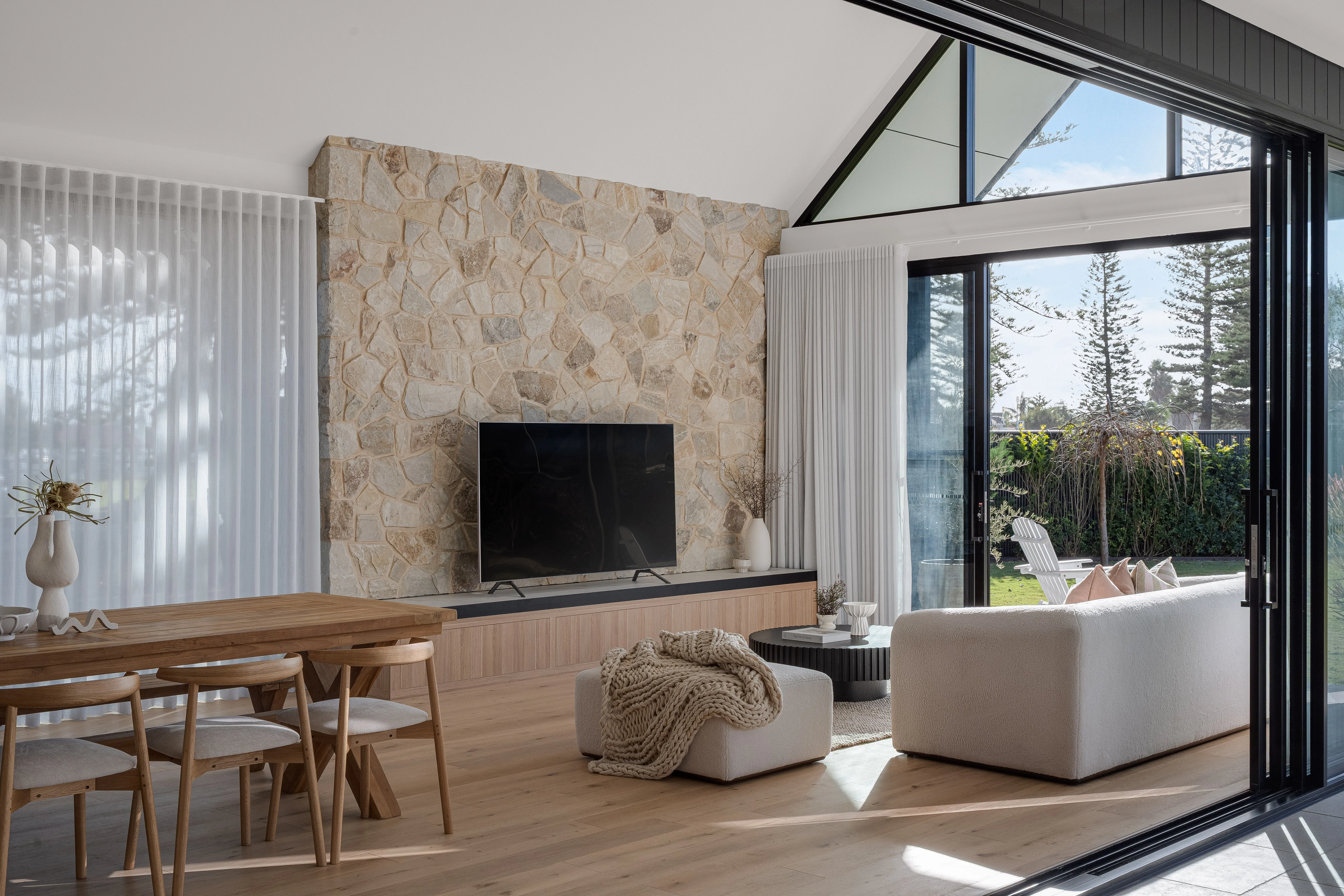 Its creamy quartzite limestone cladding offers versatile design options, transforming with different grouting and installation methods to suit your aesthetic.