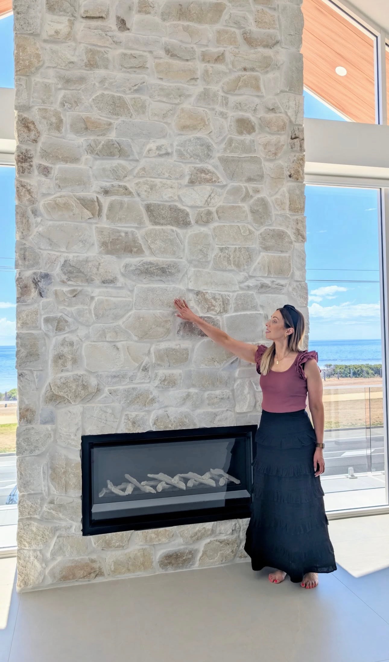Its creamy quartzite limestone cladding offers versatile design options, transforming with different grouting and installation methods to suit your aesthetic.